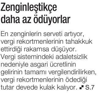 En zenginlerin serveti artıyor, vergi rekortmenlerinin tahakkuk ettirdiği rakamsa düşüyor. Vergi sistemindeki adaletsizlik nedeniyle asgari ücretlinin gelirinin tamamı vergilendirilirken, vergi rekortmenlerinin ödediği tutar devede kulak kalıyor.