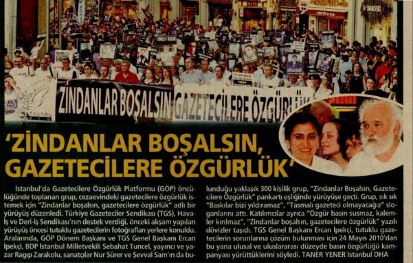 Türkiye Gazeteciler Sendikası (TGS), Havaİş ve Deri-lş Sendikası’nın destek verdiği, önceki akşam yapılan yürüyüş öncesi tutuklu gazetecilerin fotoğraftan yerlere konuldu. Aralarında, GÖP Dönem Başkanı ve TGS Genel Başkanı Ercan İpekçi. BDP İstanbul Milletvekili Sebahat Tuncel, yayıncı ve yazar Ragıp Zarakolu, sanatçılar Nur Sürer ve Şevval Şam’ın da bulunduğu yaklaşık 300 kişilik grup, "Zindanlar Boşatsın, Gazetecilere Özgürlük" pankartı eşliğinde yürüyüşe geçti.