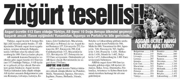 Türkiye, asgari ücrette 9 Avrupa Birliği (AB) üyesini geride bıraktı. 27 AB üyesinden 20’sinde asgari ücret uygulanırken, temmuz itibanyla Bulgaristan’da 148 Euro olan bu rakam Lüksemburg’da 1801 Euro’ya kadar çıkıyor. AB istatistik kurumu Eurostat’m verilerine göre asgari ücretin 412 Euro’yu (net 337) bulduğu Türkiye, 9 AB üyesini ve gelecek yıl üye olacak Hırvatistan’ı geride bırakıyor. Asgari ücretin Türkiye’dekinden daha düşük olduğu AB üyeleri arasında Bulgaristan’ın yanı sıra Romanya, Litvanya, Letonya, Estonya, Çek Cumhuriyeti, Macaristan, Slovakya ve Polonya da var.